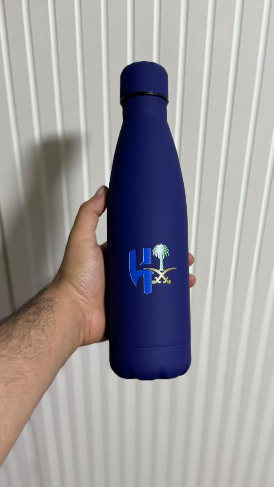 كوب حراري أنيق يجمع بين شعار المملكة العربية السعودية وشعار نادي الهلال السعودي.