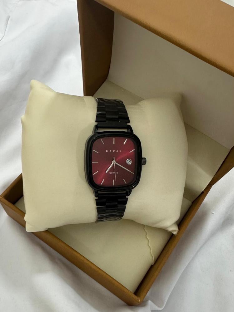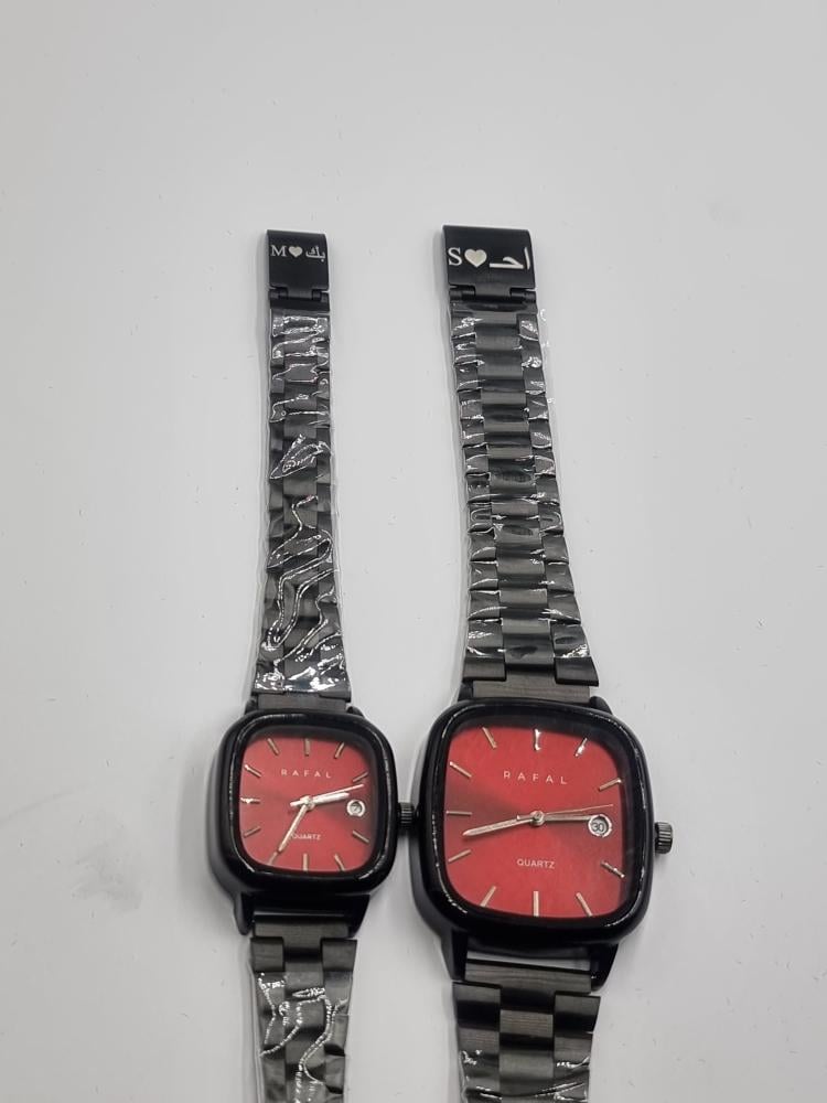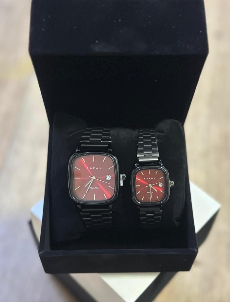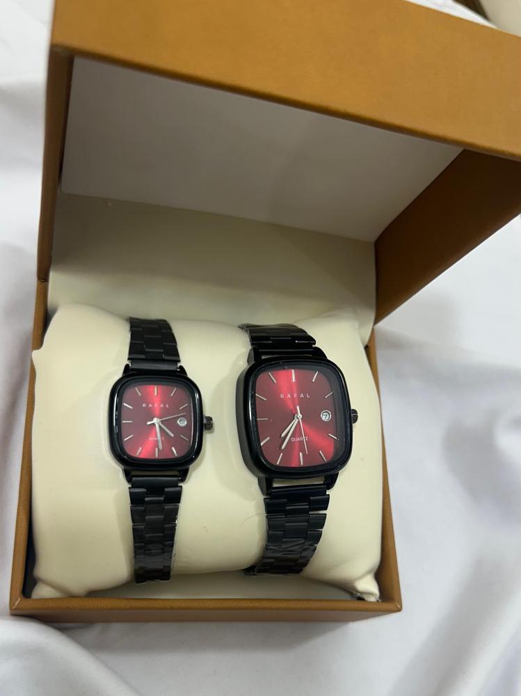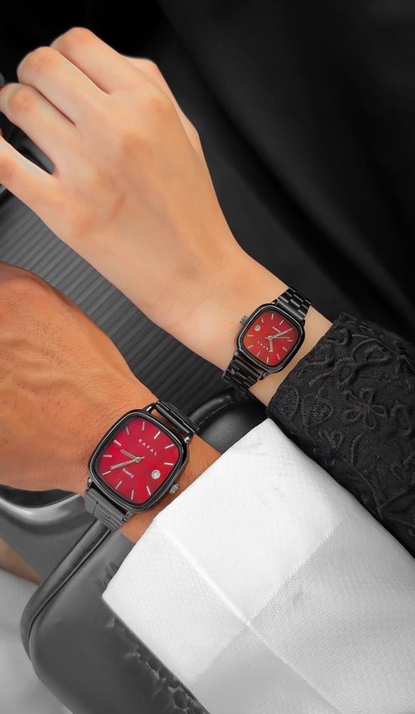 ساعات RAFAL اسود مع احمرساعة رجالية + ساعة نسائيةذات تصميم مميز وعصريمقاومة للماء بشكل سطحيتحكم بمقاس السير بشكل سلستوصلك في باكج مرتب ومناسب للإهداء