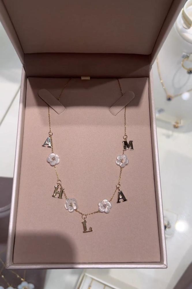 اخطفي الأنظار وامنحي نفسك لمسه من الفخامة. حسب المواصفات التألية. سلسال الأحرف بتصميم أنيق مع ورد صدف الزركون. لون الورد ابيض. تصميم الاسم عربي أو إنجليزي. مطلي ذهب عيار 21. ضمان الون من رافال. تأتي بعلبه فاخره وكيس عليها رافال.