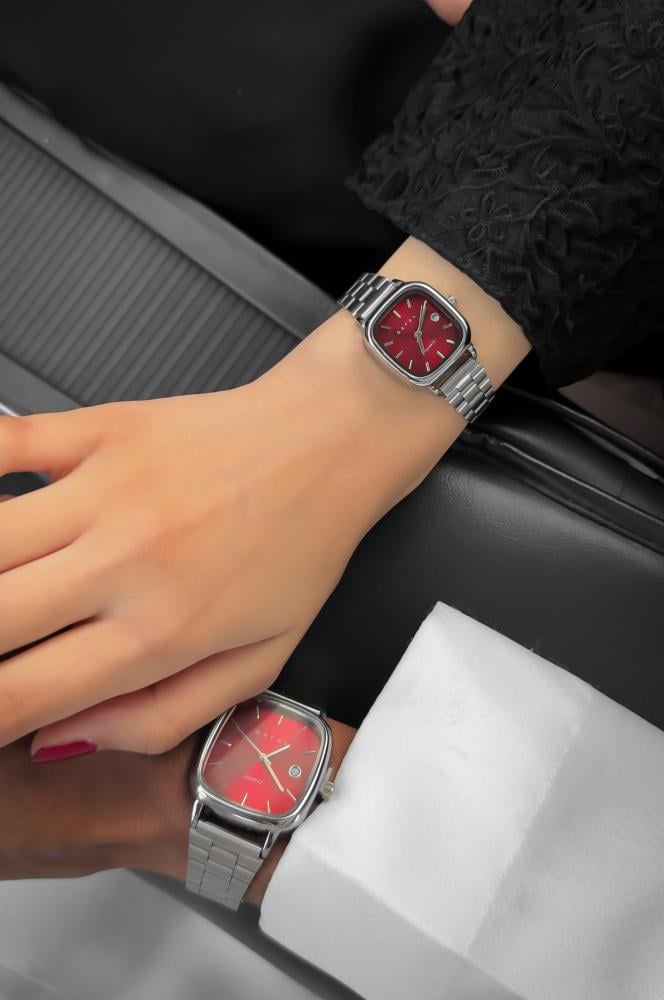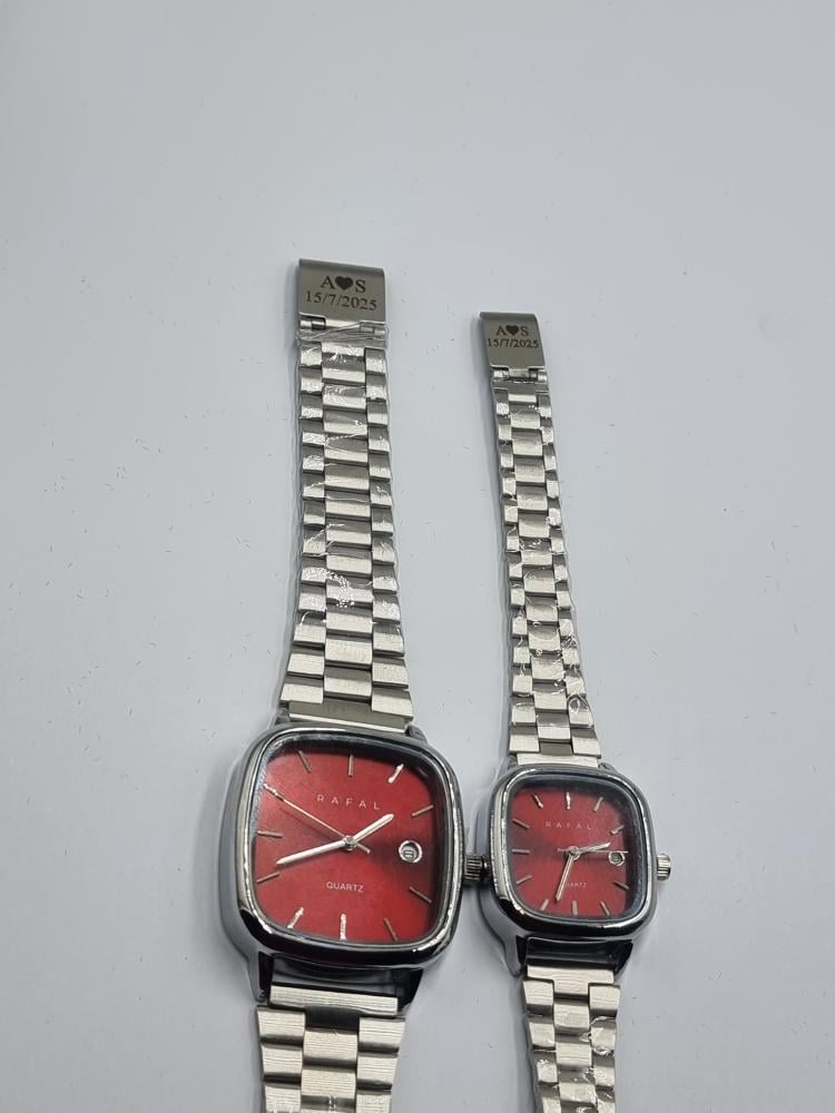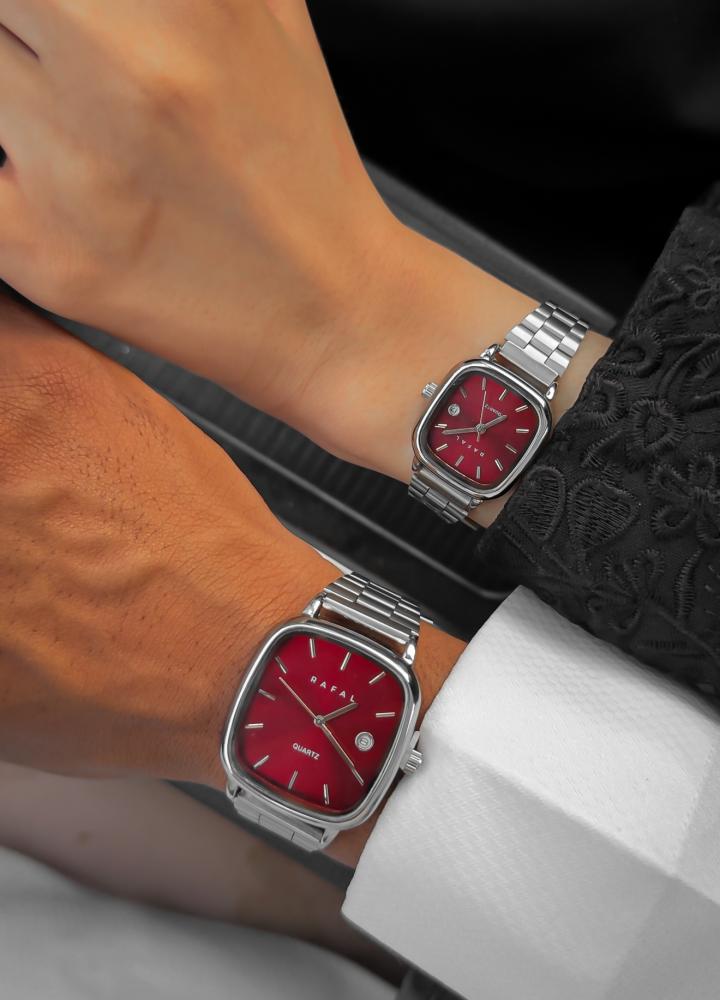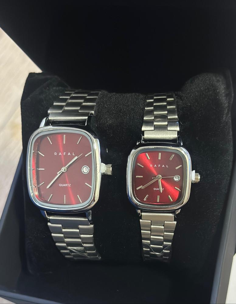 ساعات RAFAL فضي مع احمرساعة رجالية + ساعة نسائيةذات تصميم مميز وعصريمقاومة للماء بشكل سطحيتحكم بمقاس السير بشكل سلستوصلك في باكج مرتب ومناسب للإهداء