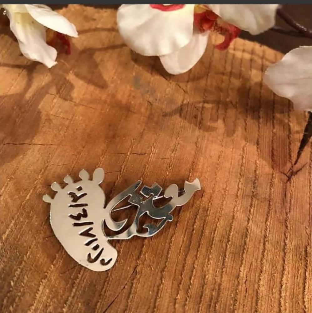• بروش أنيق منقوش عليه اسم الطفل وتاريخ أول خطوة