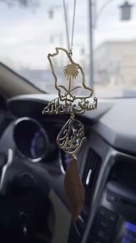 تعليقة سيارة عود بالاسم مع شكل خريطة المملكة متوفر بطلاء ذهبي أو فضي أصلي وعبارة استودعتك الله بتصميم فني. من رافال أجمل تعليقات سيارة