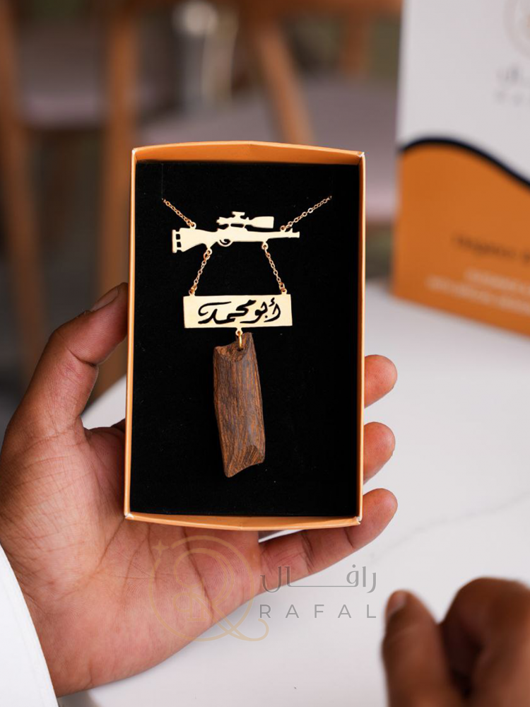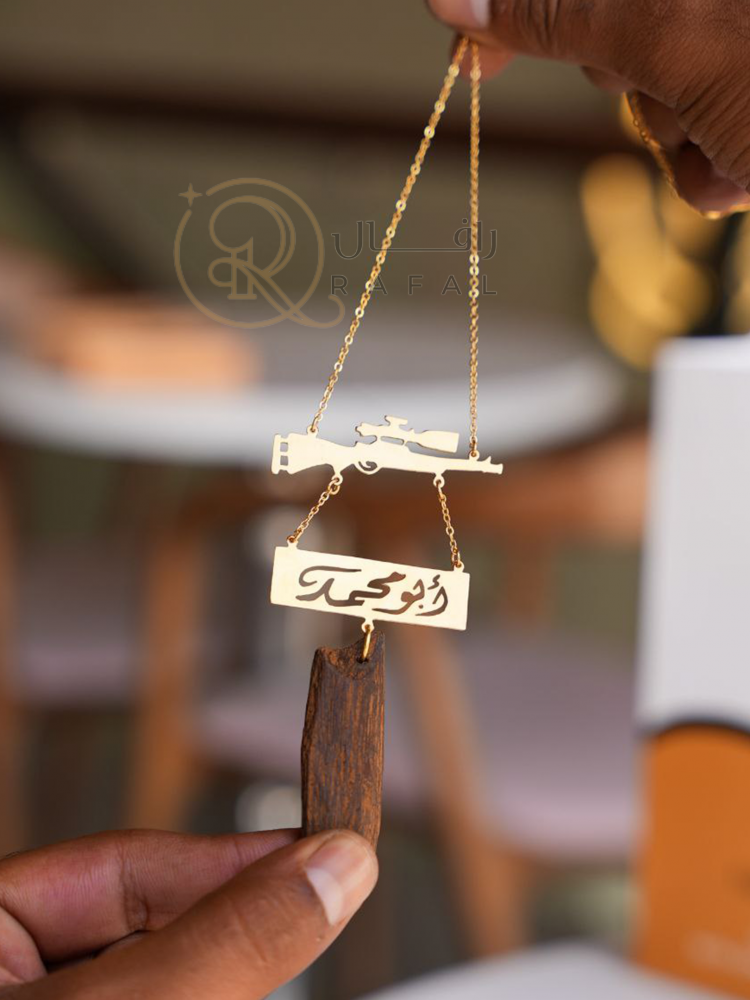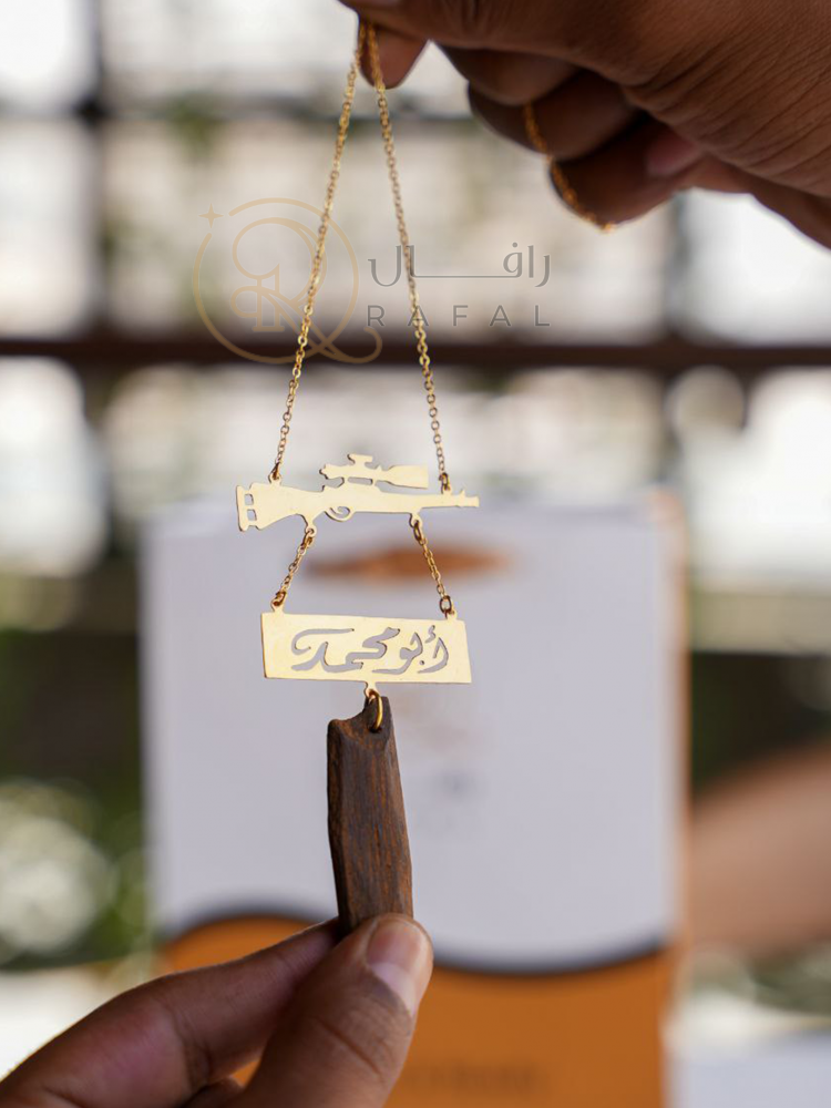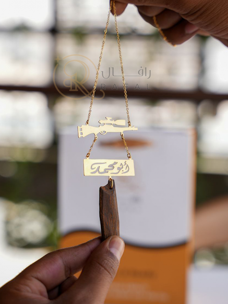تعليقة كسرة عود بالاسم وتصميم سلاح هيبة وفخامة. تعليقة سيارة راقية تتوفر بطلاء ذهبي أو فضي حسب الطلب. بكل حب يقدم لكم رافال أرقى تعليقات سيارة وهدايا رجالية