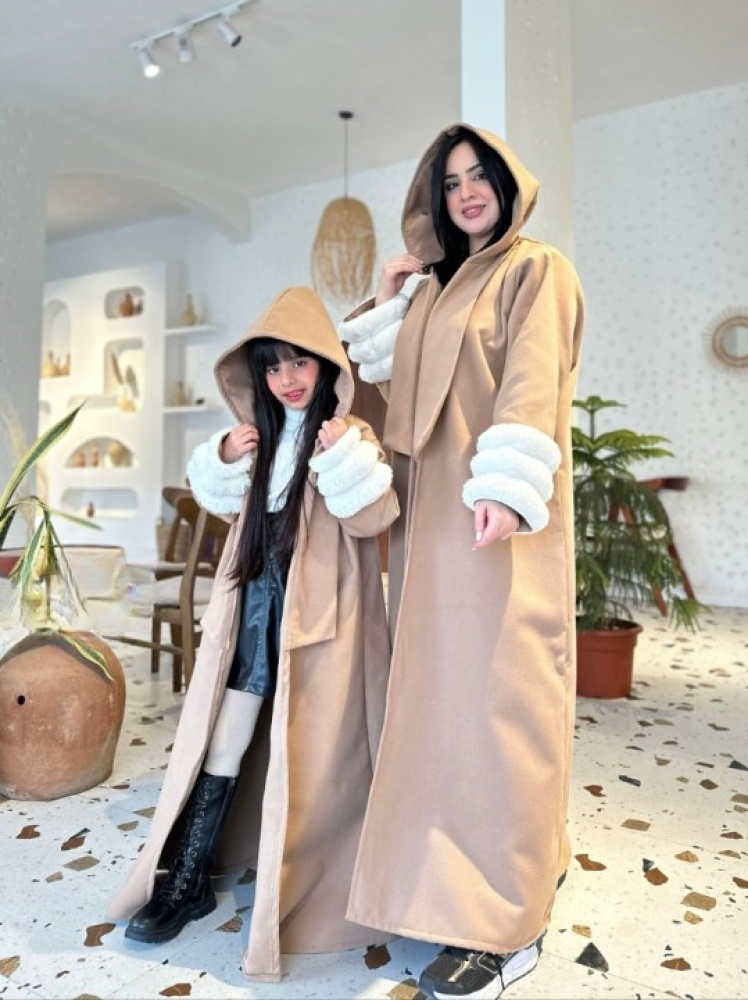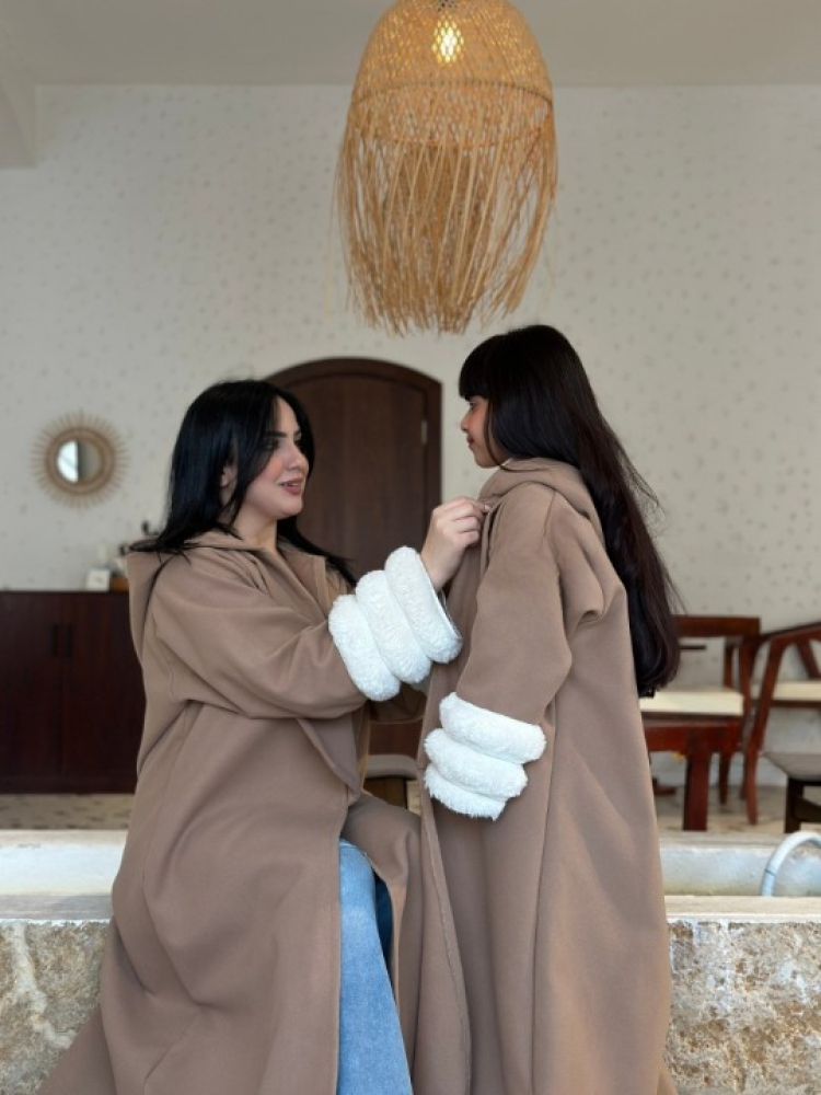 فروة شتوية مفتوحة صممت بطريقة عصرية ،منسوج من الجوخ ، اضيفت لها فرو المقلم الناعم في الاكمام ، اعطاها مظهر شتوي راقي وجميل ..المقاسات مثل مقاس العباية العاديه