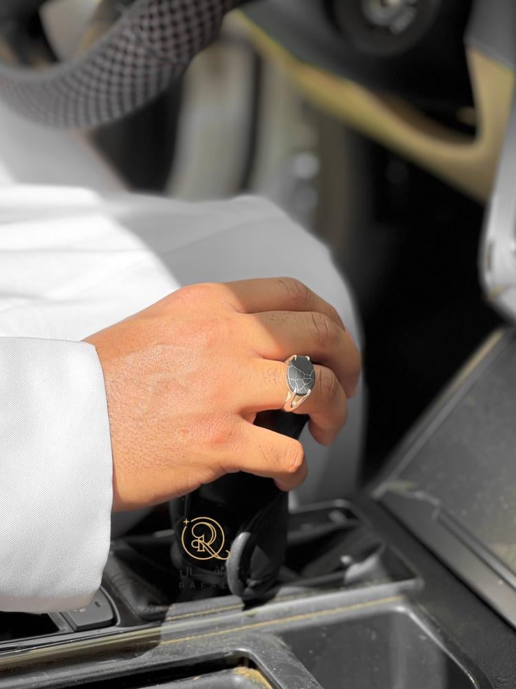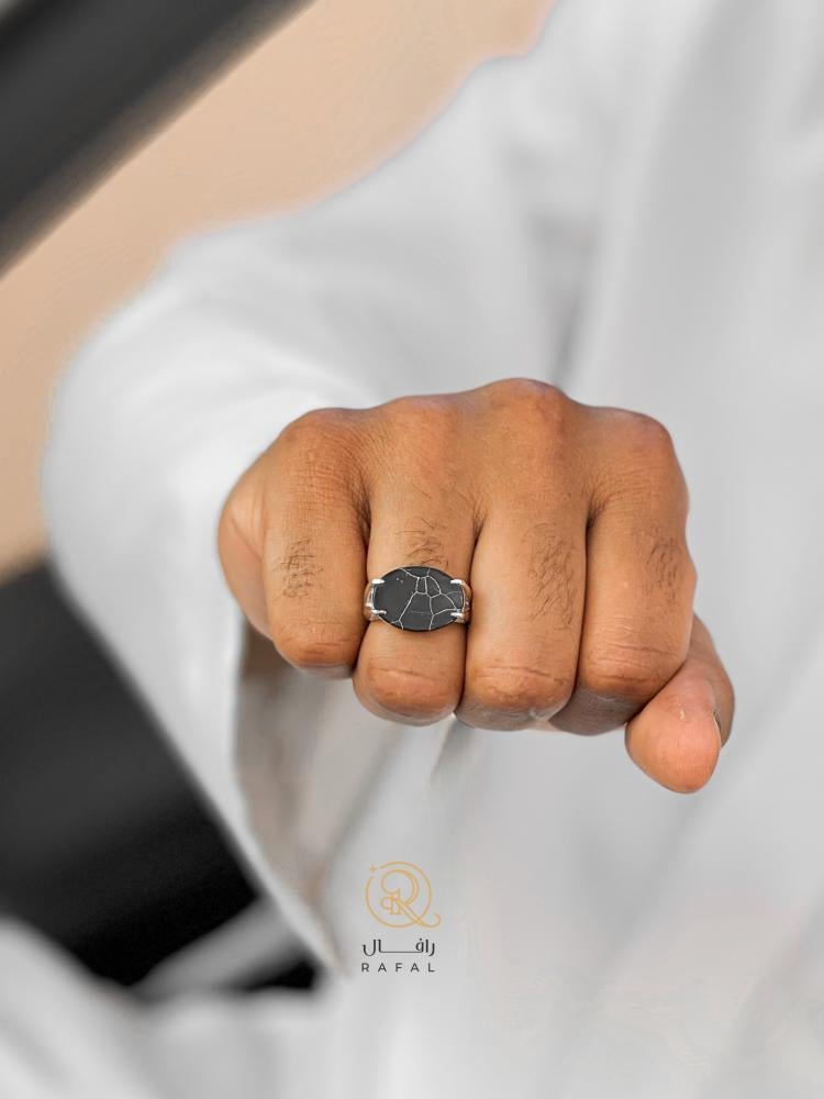 خاتم ملكي بتصميم راقي وأنيق، مصنوع من الفضة عيار 925 المقاومة للصدأ والتي لاتتأثر بالحرارة ولا الماء، يضم في وسطه قطعة من الحجر باللون الأسود المعرق مع كتابة الاسم حسب الطلب.