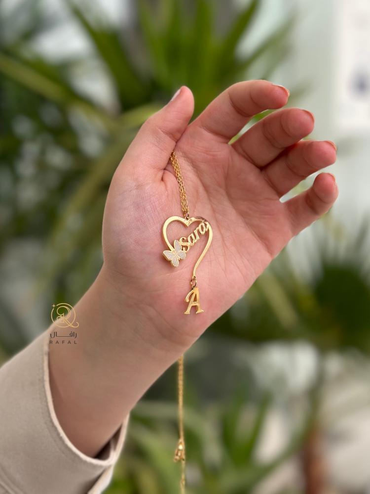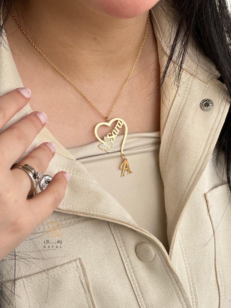 - تصميم فريد: تصميم سلسال بالاسم مطلي بالذهب أو الفضة مع قلب وحرف، ليضفي لمسة من الأناقة والرومانسية.